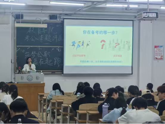 2025年9月25日,tyc7111cc太阳成集团于逸夫楼B303教室顺利举办“筑梦公职,赢在起跑”公考专题讲座。本次讲座特邀资深考公指导专家秦亚楠老师主讲,吸引众多有考公意向的同学到场聆听。