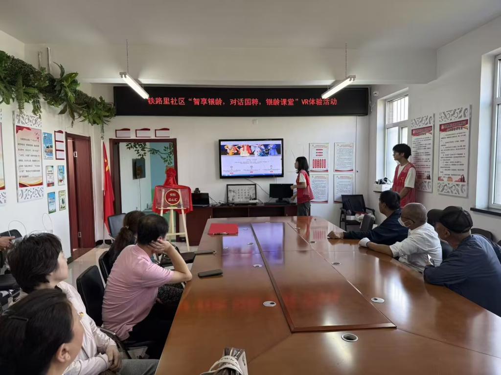 活动现场,支部党员志愿者化身“科技向导”,用通俗易懂的语言向老年居民讲解VR设备的操作原理与使用技巧。面对部分居民对智能设备的陌生感,志愿者们耐心十足,手把手协助老人佩戴设备、调试画面清晰度与音效参数,确保每位参与者都能顺利体验。当VR设备开启的瞬间,老年居民仿佛“穿越”到京剧演出现场——不仅能清晰看见戏服上精致的刺绣纹样,还能沉浸式感受舞台灯光、锣鼓伴奏带来的演出氛围。此次活动创新性地将VR技术与京剧文化相融合,既让老年居民在银龄课堂中近距离领略传统文化的独特魅力,也为传统文化的传承与普及注入了科技新活力,让“老有所乐”更添时代色彩。