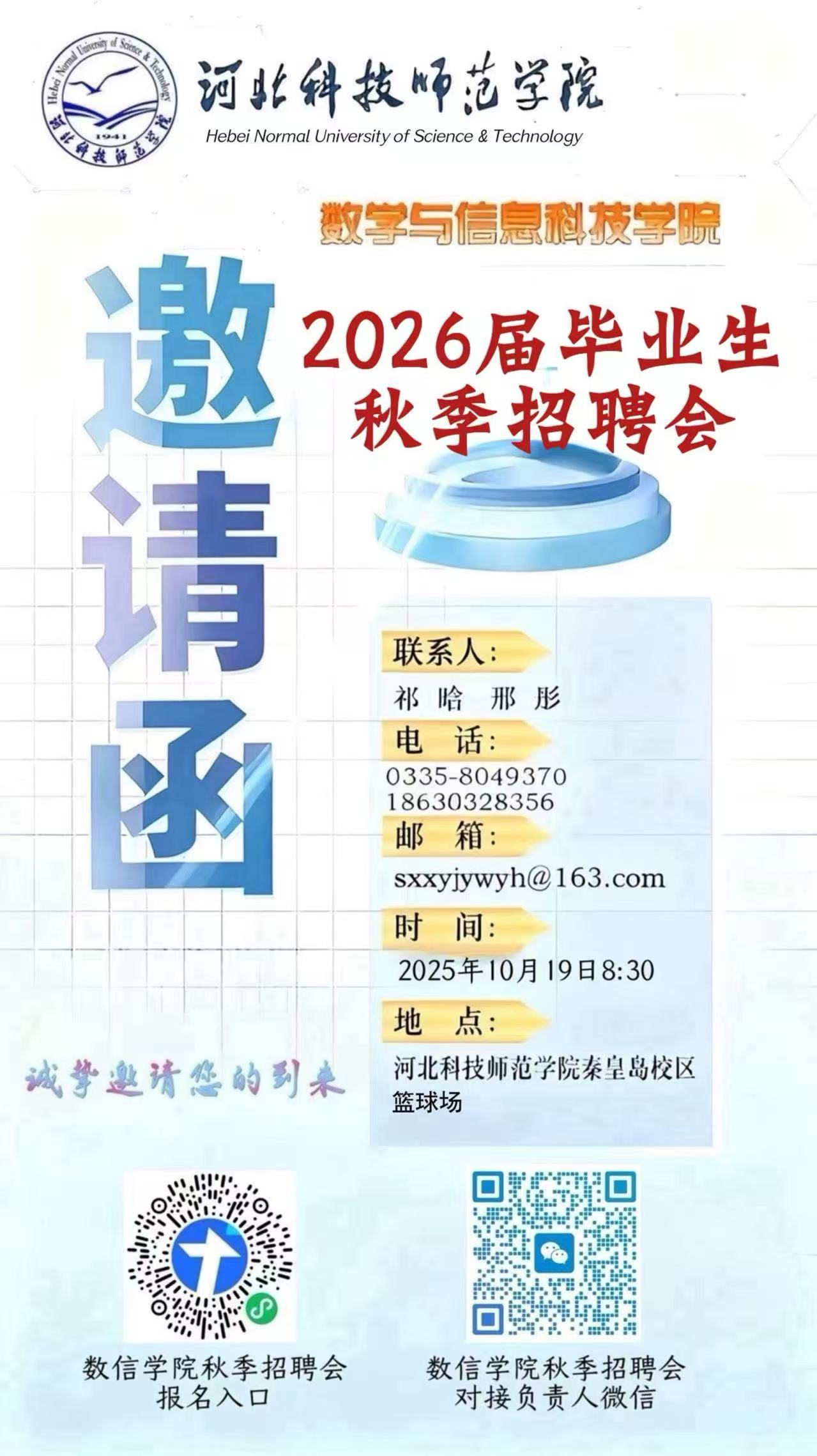 太阳成tyc7111cc2026届毕业生秋季校园招聘会10月19日(周日)上午8点在秦皇岛校区篮球场举办。tyc7111cc太阳成集团向各领域企业发出诚挚邀约---学院2026届毕业生677人,其中研究生29人,本科生648人,涵盖数学与应用数学、计算机科学与技术、网络工程、人工智能、数据科学与大数据技术、物联网工程、应用统计学、数字媒体技术等专业,学生不仅具备扎实的理论功底,同时积累了丰富实践经验。诚挚邀请用人单位来我院选聘人才,扫码即可报名!